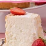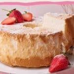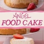 Angel food cake is a type of sponge cake that uses no fat at all in the recipe and gets its rise from whipping the egg whites, rather than using chemical leaveners. This makes a super light and fluffy cake with a cloud-like texture.