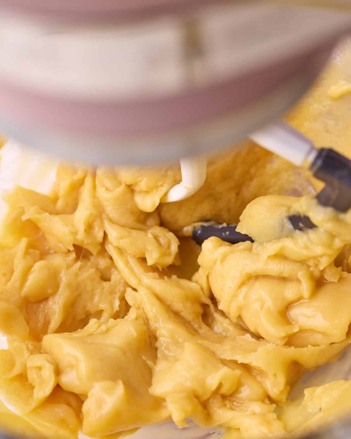- Once cooled, turn the mixer on low speed with a paddle attachment fitted and start adding the eggs, one at a time, mixing in between each addition until fully incorporated. It should be glossy and smooth.