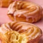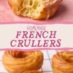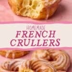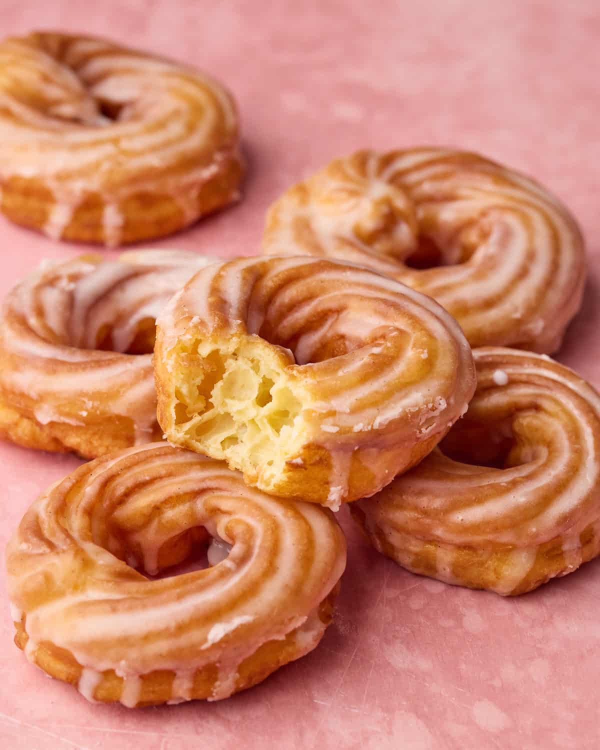 French crullers are made with choux pastry (the same thing used to make cream puffs and eclairs). When they are fried in hot oil, the pastry releases steam, which makes the inside puff up into a honeycomb structure to make super soft donuts with an almost croissant-like texture.