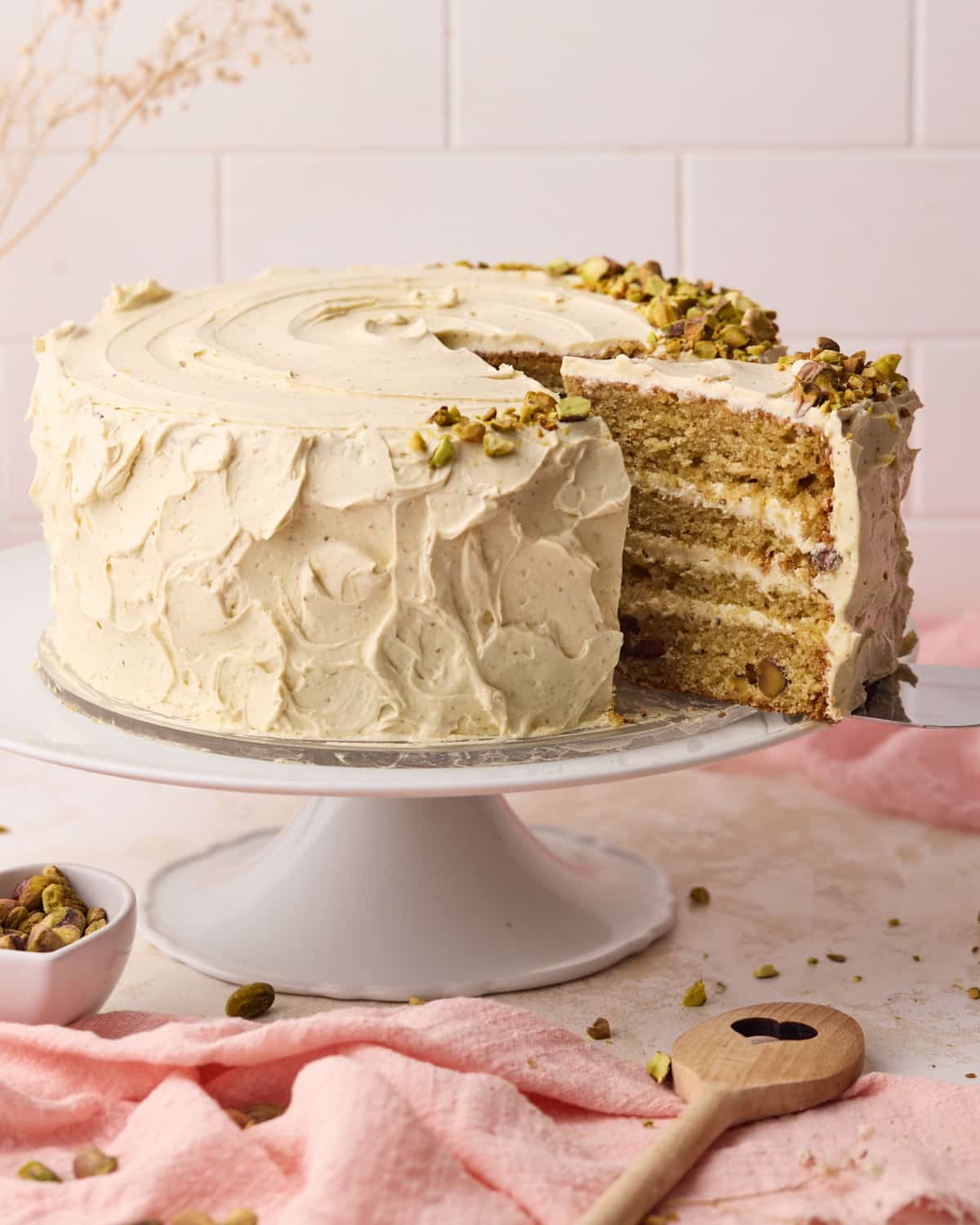 This soft, fluffy pistachio layer cake is made with real pistachio paste and chopped pistachios for a deep, nutty flavour in every bite. No artificial flavouring, no pudding mix - just pure pistachio goodness.