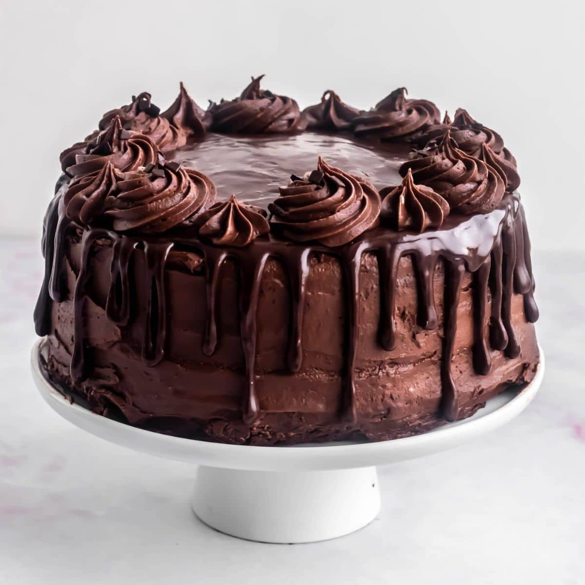 Stack the cakes one by one with an even layer of cooled chocolate ganache spread in between each layer.