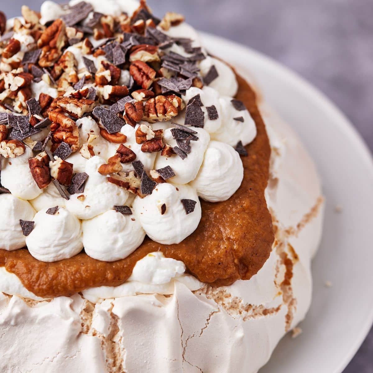 Turn off the oven and leave the pavlova in there until it has completely cooled. If you need the oven back before then, you can take it out after an hour, but do not take it out right away or the temperature change will cause crackingIn the meantime, you can prepare the pumpkin spice curd